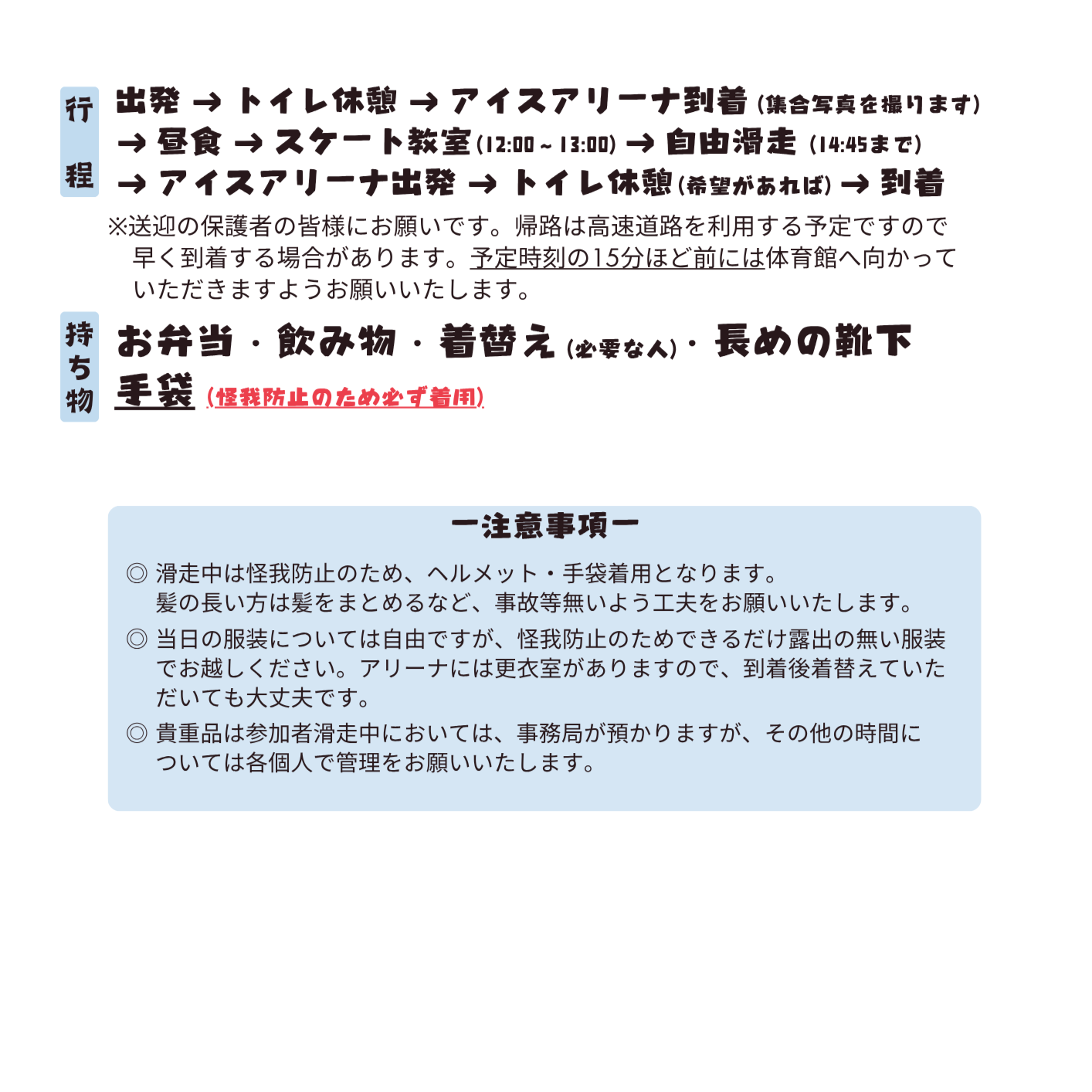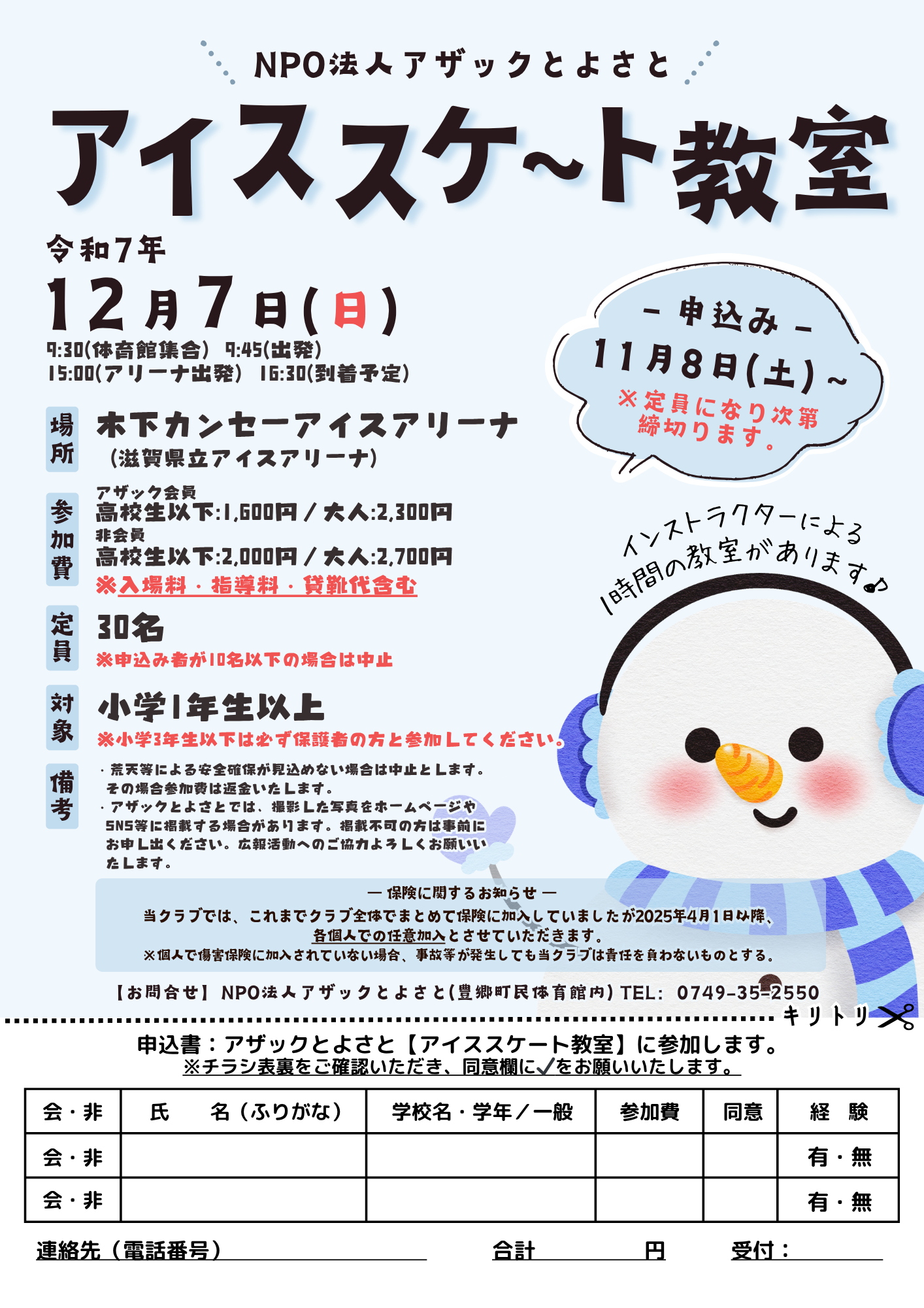 2025年度 事業開催案内 随時更新 画像をクリックすると拡大表示されます インスタグラムにて情報を発信していますので、 @azactoyosatoinfo フォローよろしくお願いします! 2025年度 事業開催案内 随時更新 画像をクリックすると拡大表示されます インスタグラムにて情報を発信していますので、 @azactoyosatoinfo フォローよろしくお願いします! アイススケート教室(表) アイススケート教室(裏) ギャラリー