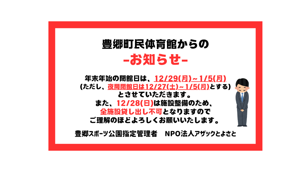令和7年度アザック会員募集! 令和7年3月1日(土)申込みスタート 新たなスクールやイベントが盛りだくさん!お申込みは豊郷町民体育館窓口までお越しください。 令和7年度も更に充実したプログラムやイベントを企画し、皆さんに楽しんでいただけるよう努めてまいります。皆様のお申込みをお待ちしております! 会員について スクール・サークル 【お問合せ】NPO法人アザックとよさと事務局(豊郷町民体育館内) 令和7年度アザック会員募集! 令和7年3月1日(土)申込みスタート 新たなスクールやイベントが盛りだくさん! お申込みは豊郷町民体育館窓口までお越しください。 令和7年度も更に充実したプログラムやイベントを企画し、 皆さんに楽しんでいただけるよう努めてまいります。 皆様のお申込みをお待ちしております! 会員について スクール・サークル 【お問合せ】 NPO法人アザックとよさと事務局(豊郷町民体育館内) ,1,,{"newsType":1,"designId":"design1","newsSourceType":"typeBindNews","bindNewsId":"668dcc18-9877-4ec5-8a66-9f37cf0f175a","rssUrl":""} 2025年度 アザック便り 一覧 2025年度 アザック便り 一覧 4月号 コチラをクリック! ★今月のラインナップ ・R7年度 年間事業予定 ・アザックまつりの報告 ・やんちゃっこ、バスケ教室のお知らせ 5月号 コチラをクリック! ★今月のラインナップ ・春のアザックGG大会申込み募集 ・みんなでフィッシング体験申込み募集 ・お花見ウォーキングの報告 ・スポーツスクールのお知らせ 6月号 コチラをクリック! ★今月のラインナップ ・防災デイキャンプ申込み募集 ・ハンターゲーム申込み募集 ・春のアザックGG大会の報告 ・春のソフトボール大会の報告 7月号 コチラをクリック! ★今月のラインナップ ・魚つかみ&野外ランチ申込み募集 ・スポーツスクール第2期申込み募集 ・みんなでフィシング体験の報告 ・ウォーキングスクールについてお知らせ 8月号 コチラをクリック! ★今月のラインナップ ・星空映画会申込み募集 ・防災デイキャンプの報告 ・ハンターゲームの報告 ・魚つかみ&野外ランチの報告 9月号 コチラをクリック! ★今月のラインナップ ・後期やんちゃっこのスポーツ教室・楽しいバスケットボール教室募集 ・豊郷町民健康フェスティバルのお知らせ ・前期やんちゃっこのスポーツ教室・楽しいバスケットボール教室の報告 ・星空映画会(指定管理事業)の報告 10月号 コチラをクリック! ★今月のラインナップ ・豊郷町民健康フェスティバル2025開催のお知らせ ・秋のアザックGG大会申込み募集 ・バウムクーヘンづくり体験のお知らせ ・豊郷町ビーチボール大会のお知らせ 11月号 コチラをクリック! ★今月のラインナップ ・バウムクーヘンづくり体験申込み募集 ・紅葉ウォーキング申込み募集 ・豊郷町民健康フェスティバル2025の報告 ・犬上ふるさとウォークのお知らせ 12月号 コチラをクリック! ★今月のラインナップ ・アイススケート教室申込み募集 ・新春ボウリング大会申込み募集 ・秋のアザックGG大会の報告 ・紅葉ウォーキングの報告 arrow_right arrow_left