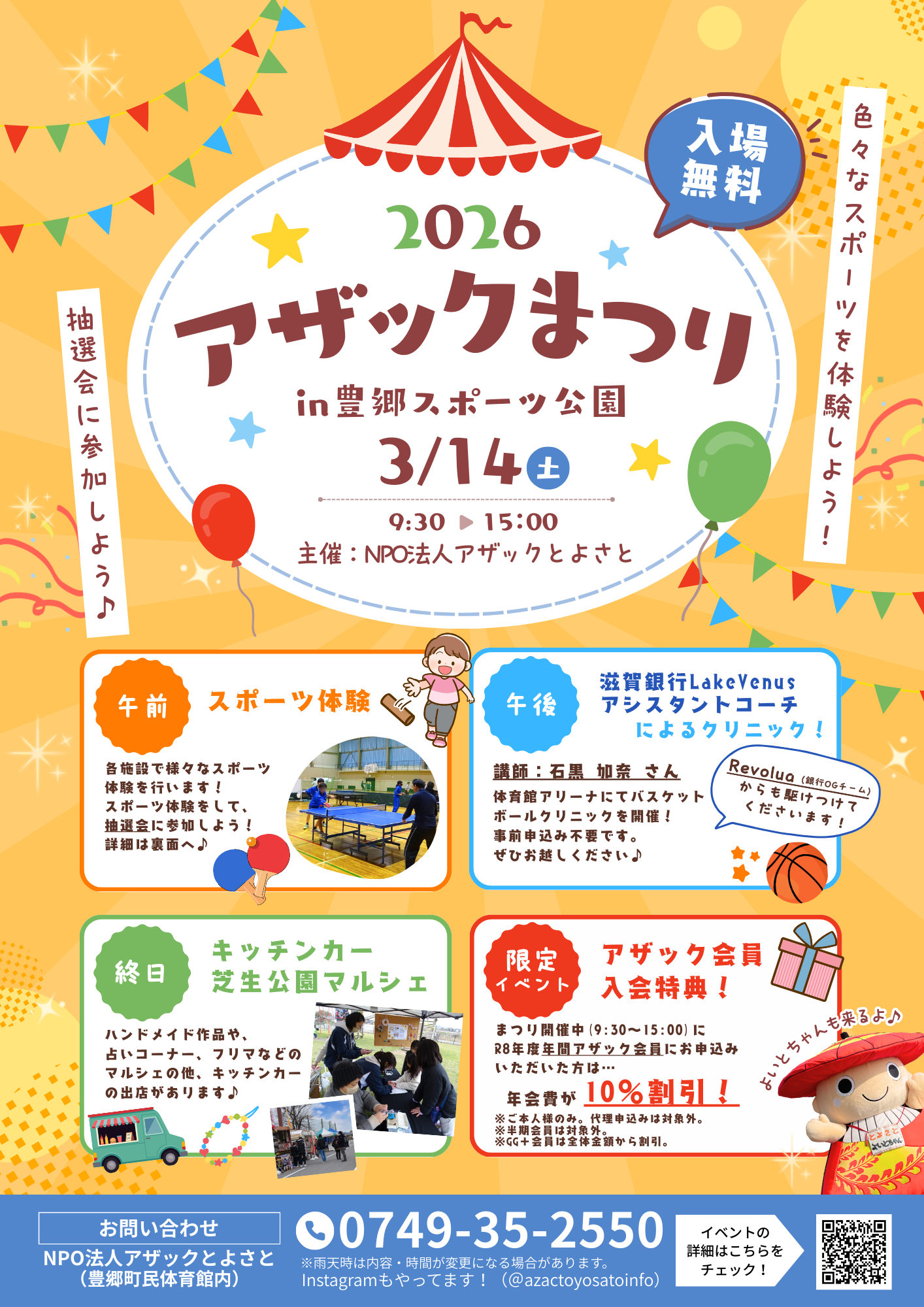 2025年度 事業開催案内 随時更新 画像をクリックすると拡大表示されます インスタグラムにて情報を発信していますので、 @azactoyosatoinfo フォローよろしくお願いします! 2025年度 事業開催案内 随時更新 画像をクリックすると拡大表示されます インスタグラムにて情報を発信していますので、 @azactoyosatoinfo フォローよろしくお願いします! アザックまつり(表) アザックまつり(裏) ギャラリー
